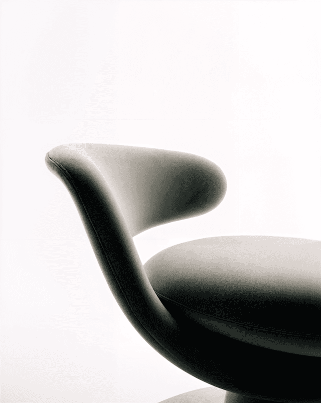 Sculptural lounge chair with continuous molded shell in matte black. Organic teardrop-shaped backrest flowing seamlessly into seat. Central pedestal base with smooth, uninterrupted surfaces