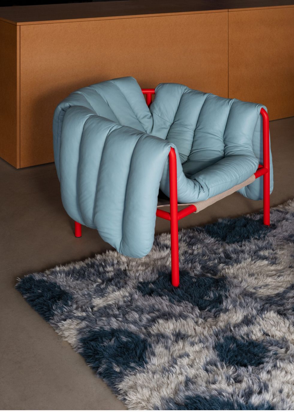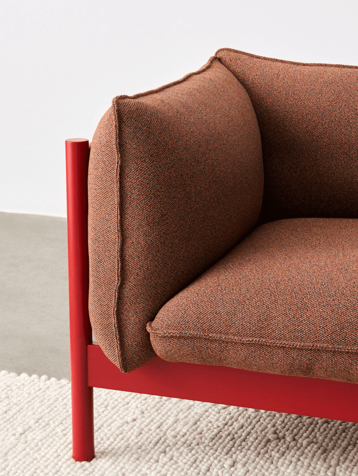 Contemporary lounge chair with powder-coated steel frame in warm terracotta red. Cylindrical tubular construction forming clean geometric skeleton with horizontal stretcher bars. Deep box-edged cushions in rust-orange tweed upholstery with multicolor flecking. Low sled base with integrated armrests where fabric sits within frame structure. Modern minimalist aesthetic with bold frame-to-fabric color contrast.